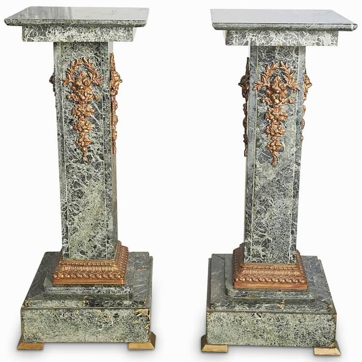 Standing 36 inches high, a set of rectangular pedestals, dore bronze and green marble, went out $1,375.
