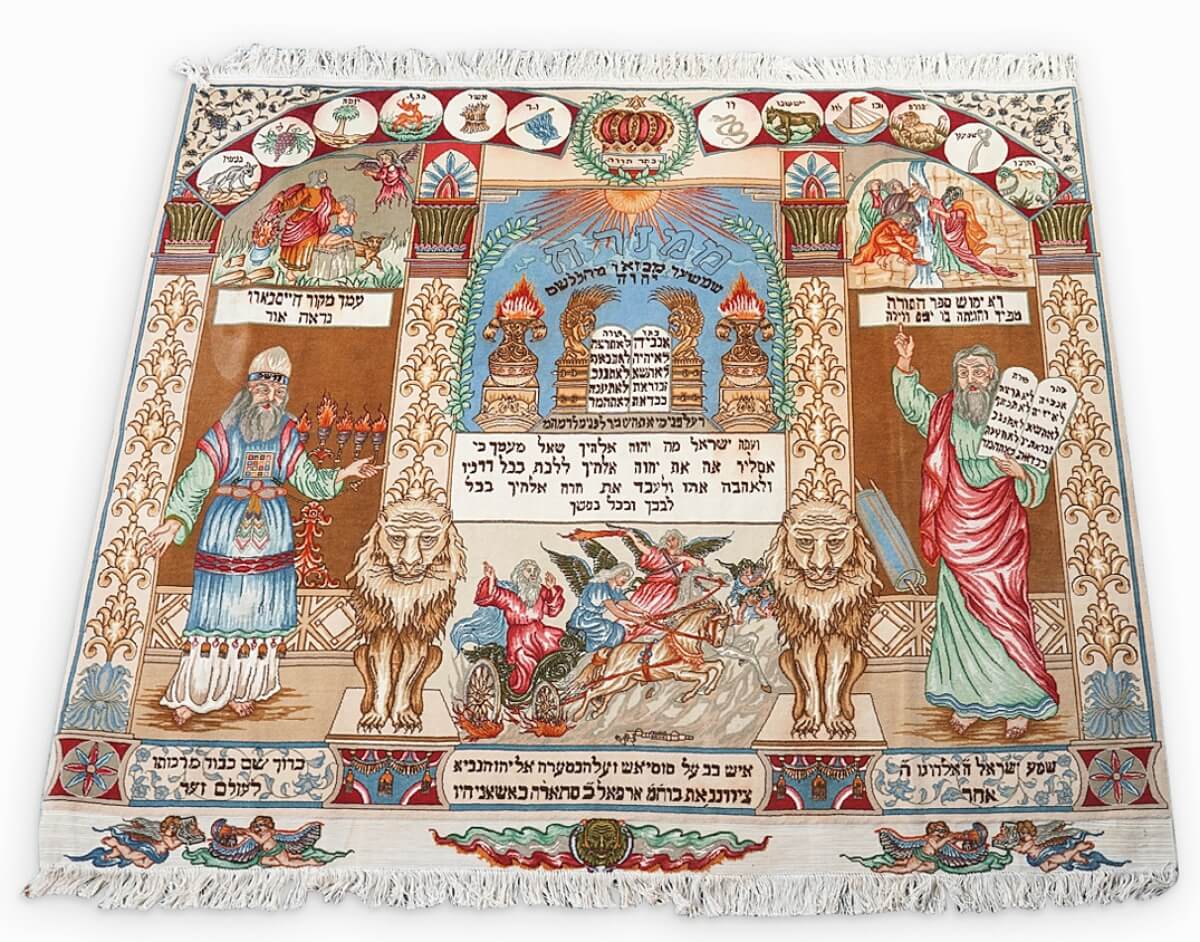 A handmade Kashan pictorial rug with multicolored Judaic-themed designs and finished with fringe accents, 71 by 76 inches, realized $1,375.