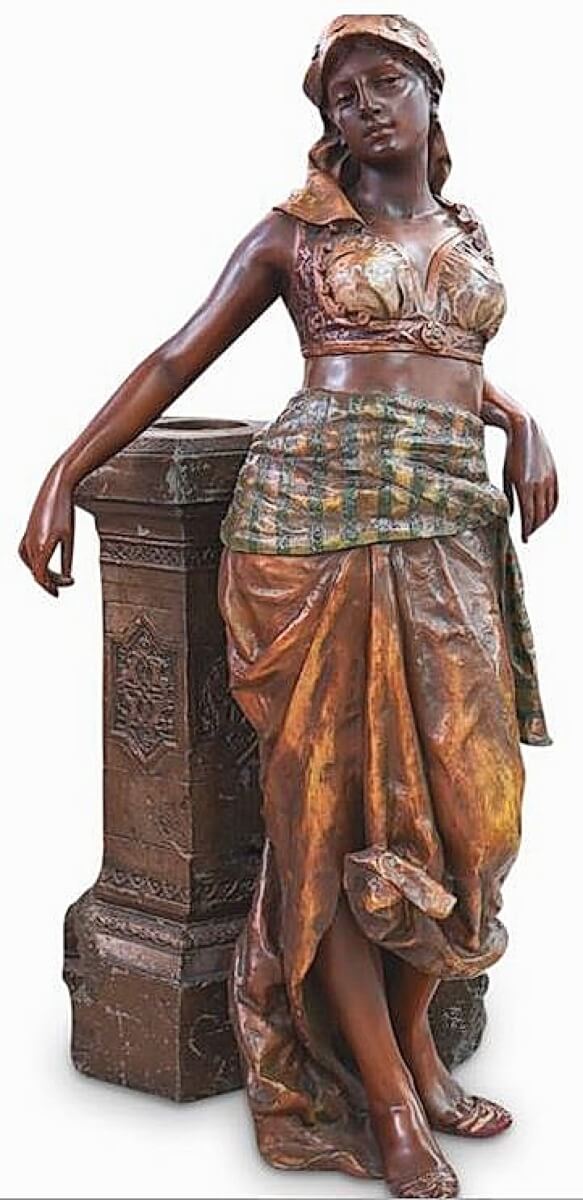 The large Orientalist polychrome statue brought $6,250. It featured a traditionally dressed exotic Middle Eastern maiden leaning against a decorative wall that had a hole for possible use as a jardiniere.