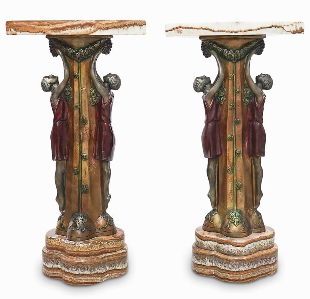 A strong result early in the sale came for this pair of Art Deco bronze and marble pedestals, each 31 inches tall, which featured maidens finished in cold-painted accents and each signed on the base “P. Seca.” The pair brought $4,030 ($200-$2,000).