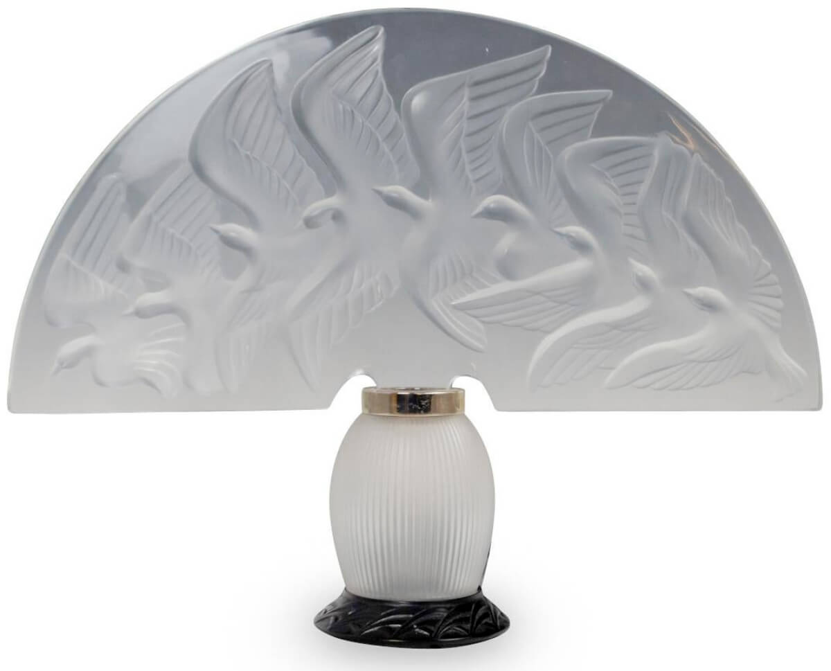 Achieving $3,600 with just two bids, this Lalique “Hokkaido” crystal lamp had been designed in 1990 by Marie-Claude Lalique, and was signed Lalique in two places. It was decorated with doves in flight and stood nearly 22 inches tall ($3/6,000).