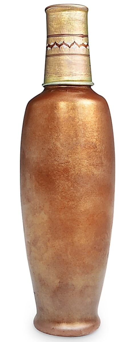 A brown aurene vase cased over translucent white with crisscrossed brown and white threading rubbed into intarsia decoration and a gold aurene collar changed hands for $11,250.
