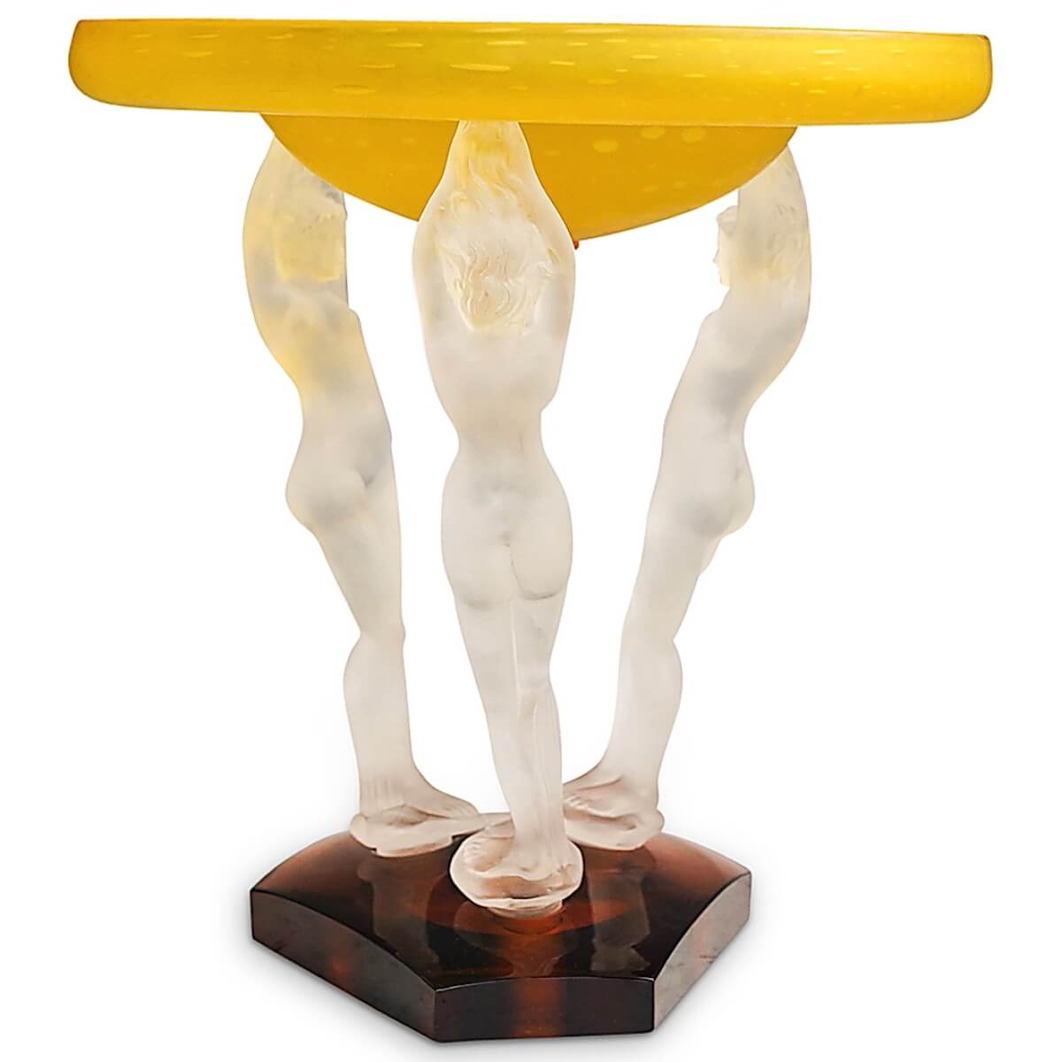 Perhaps one of only three known examples, a figural centerpiece bowl, Steuben’s “Diving Lady,” circa 1926, was bid to $16,250. Three frosted nude figures support a bright yellow bowl.