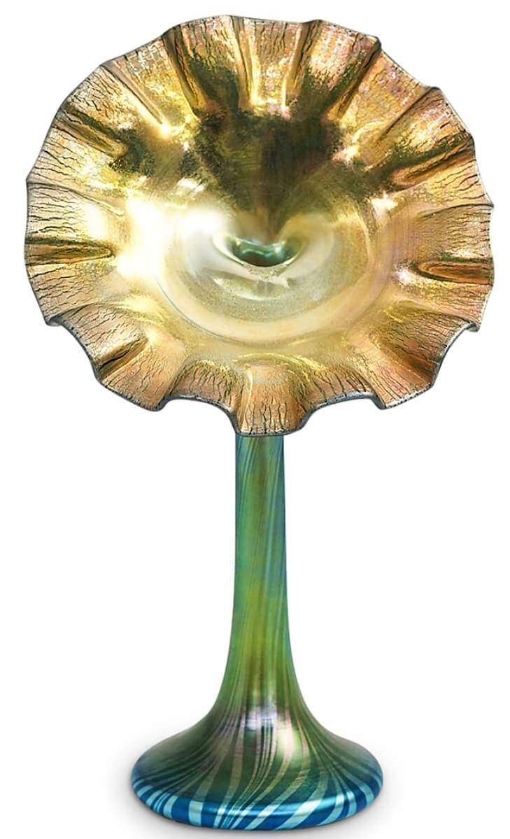 Steuben blue aurene Jack-in-the Pulpit vase, circa 1905-10, sold for $20,000.