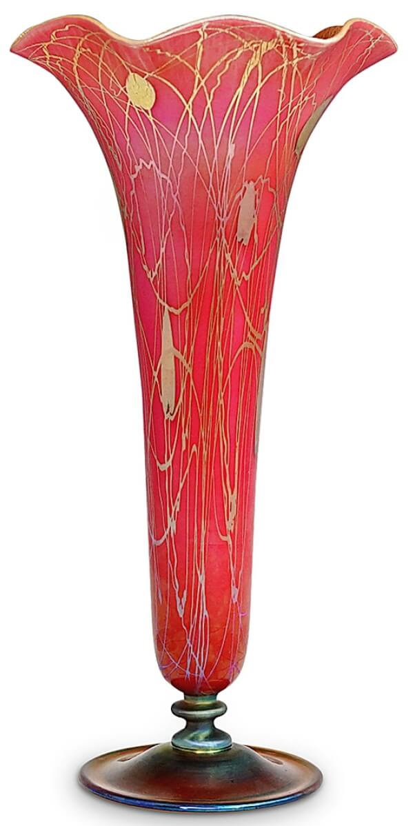 The top lot in the Alan and Susan Shovers collection of rare Steuben glass was this gold ruby footed floriform vase, circa 1910-15, that sold for $56,250 against a $1/5,000 estimate. Decorated with gold aurene leaf and random vine decorations, iridized lead glass with applied ornaments, the vase was marked “547 Aurene” and stood 12¼ inches high.