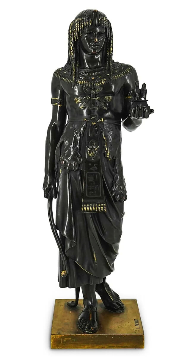 Emile Louis Picault created this bronze, “King Menthuophis,” alongside another of “Queen Nitocris,” likely wooed by the fantastical story where, following the king’s death by poisoning, the queen invited the conspirators to a banquet chamber that she then flooded with the Nile. Is it true? Unknown. “King Menthuophis” sold for $5,100.