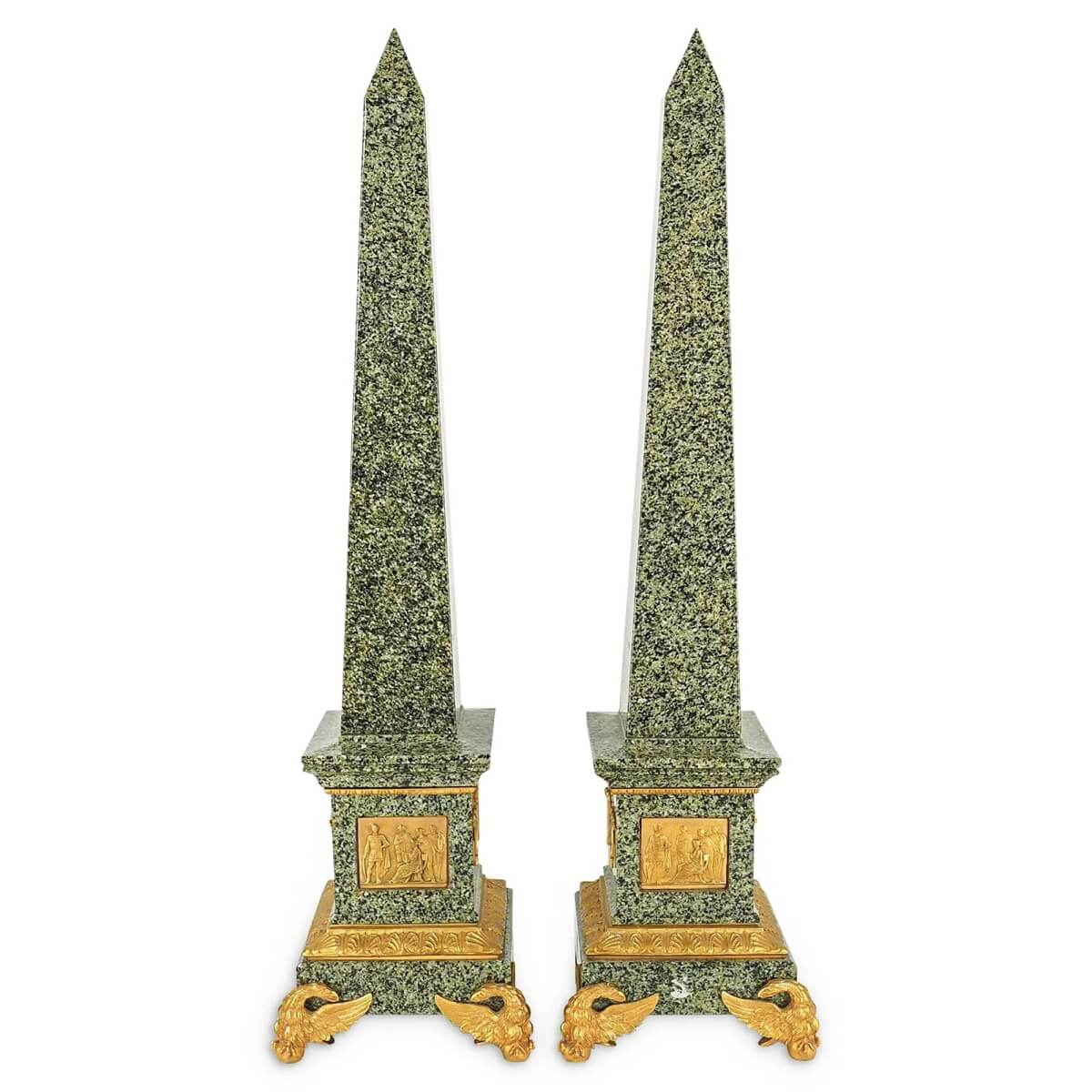 Selling for $3,750 was a pair of gilt bronze and granite obelisks rising 35 inches high. Each featured a plaque with a neoclassical image cast into it, all raised on fiery eagle feet.