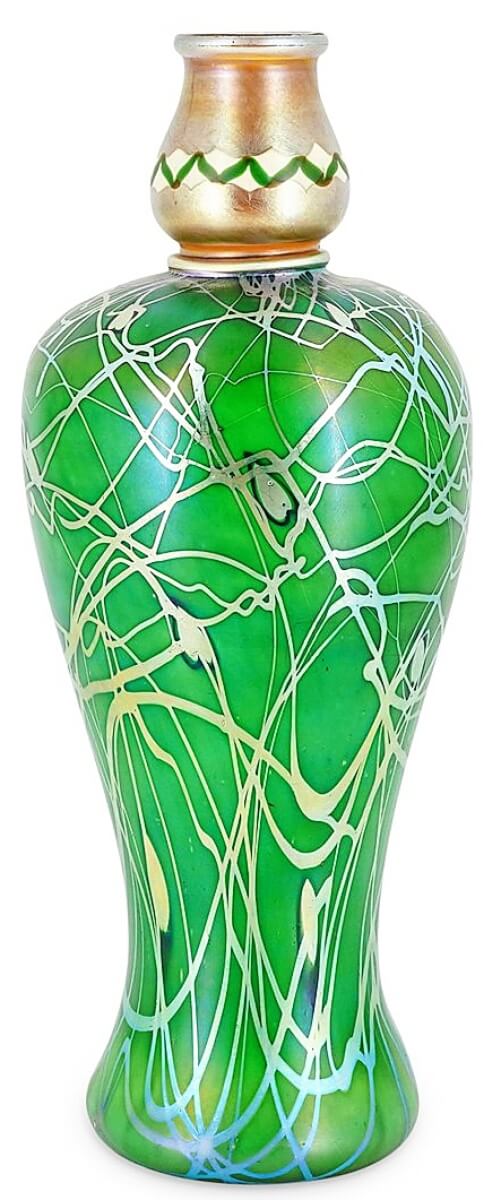 A 14½-inch-high Steuben 2052 green Aurene vase, 1903-32, with leaf and vine iridescent decoration and gold Aurene top found a buyer for $11,250.