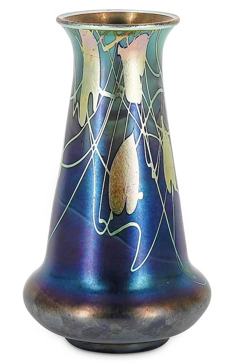 Fetching $12,500, more than five times its high estimate, was a Steuben Tyrian gold Aurene vase from the early 1900s.